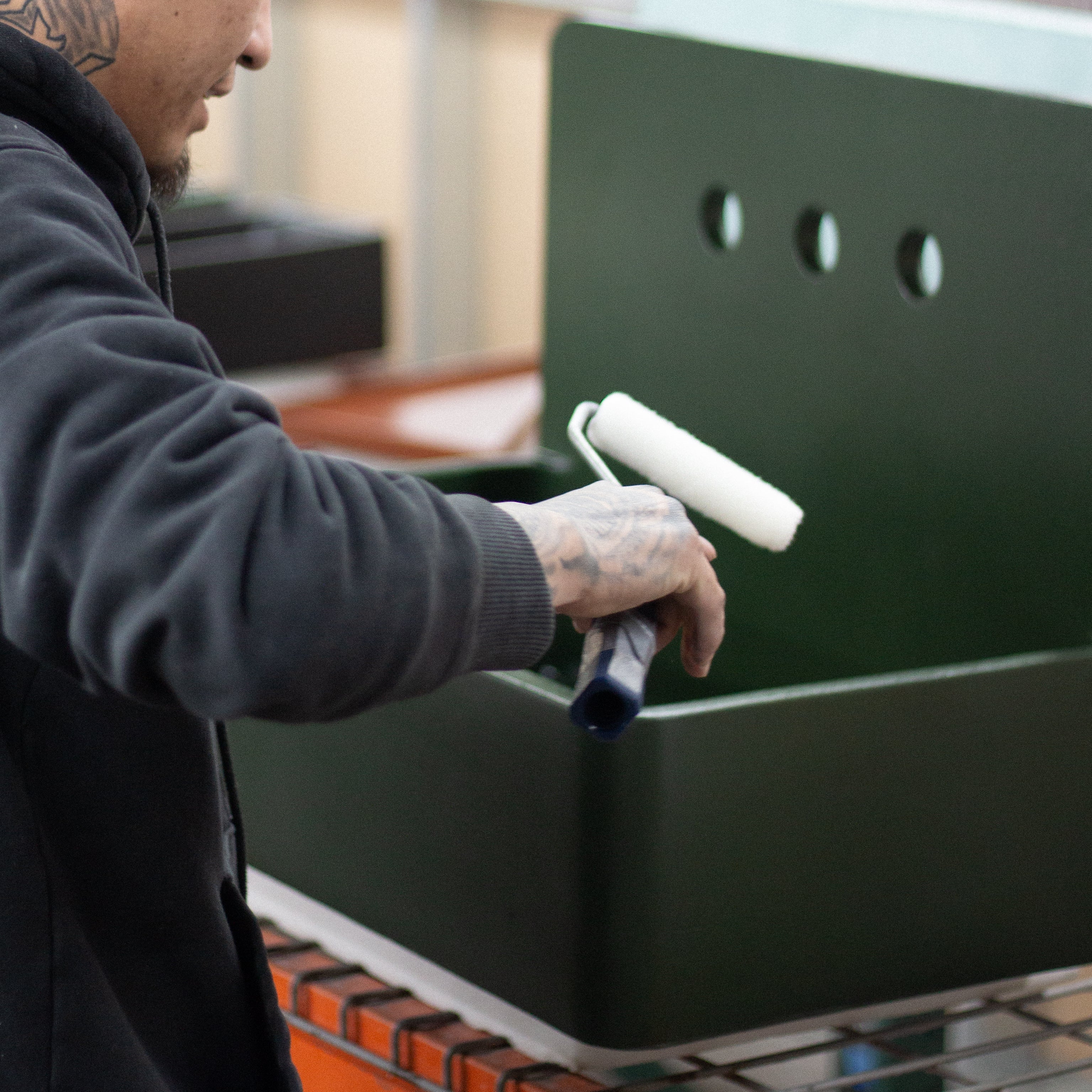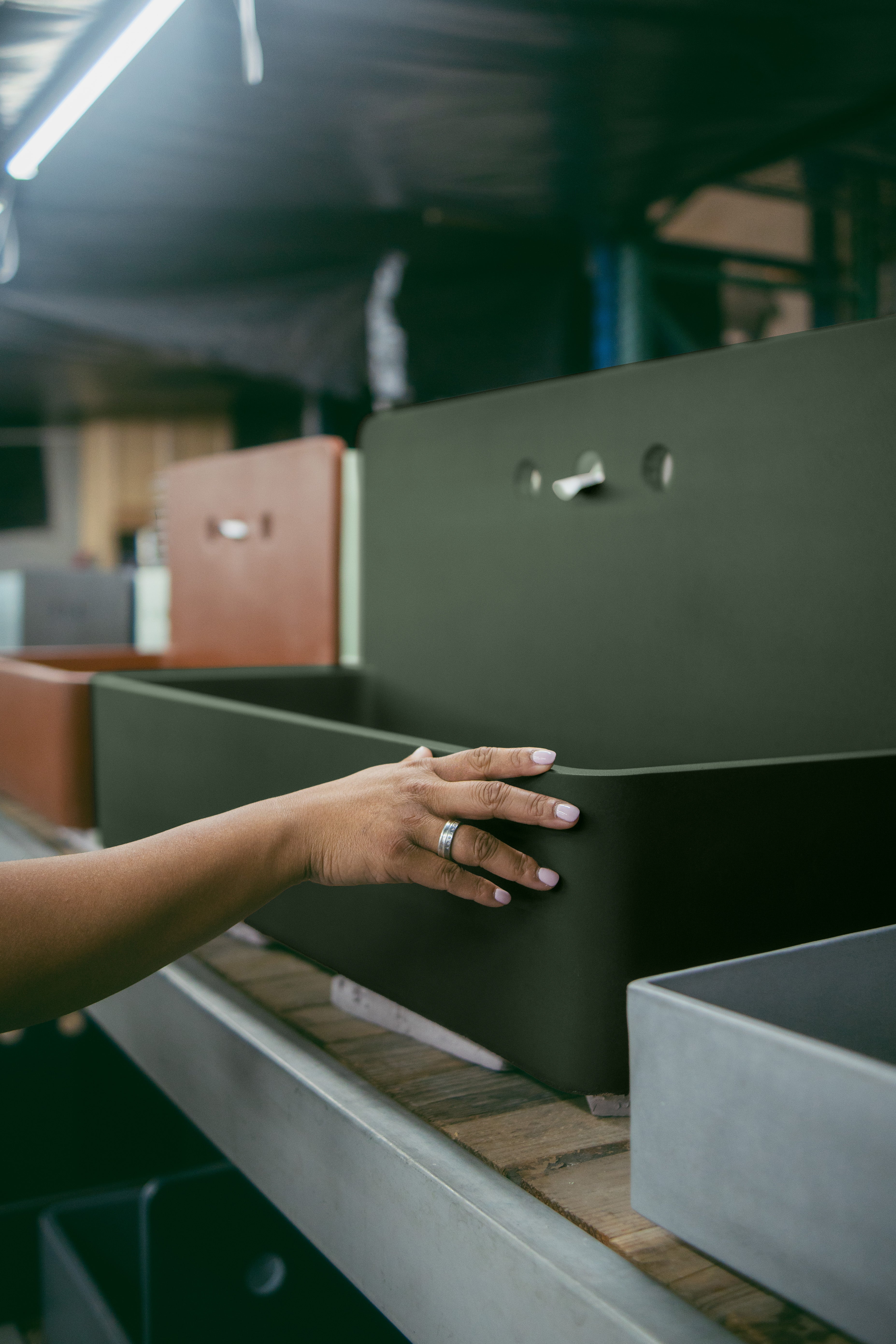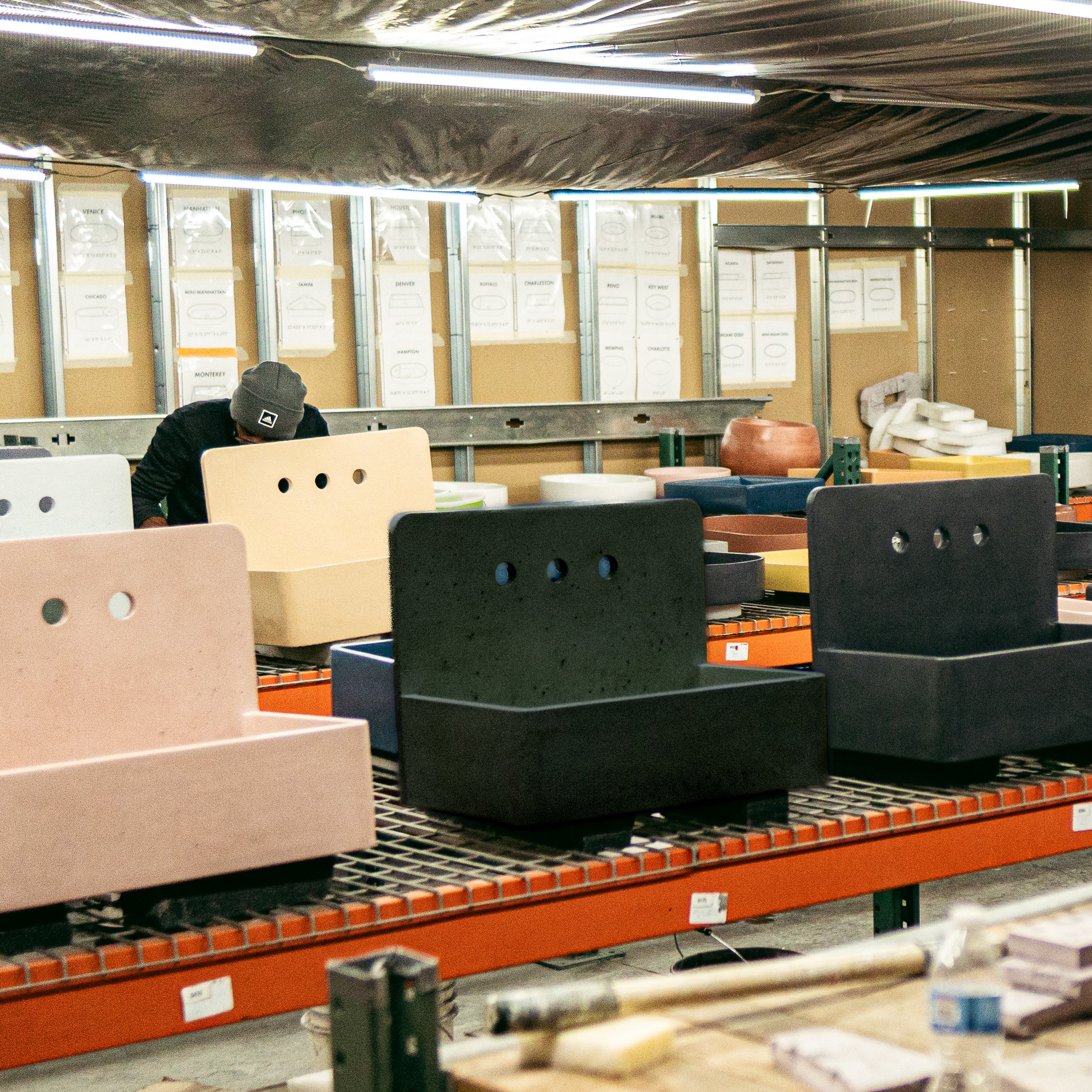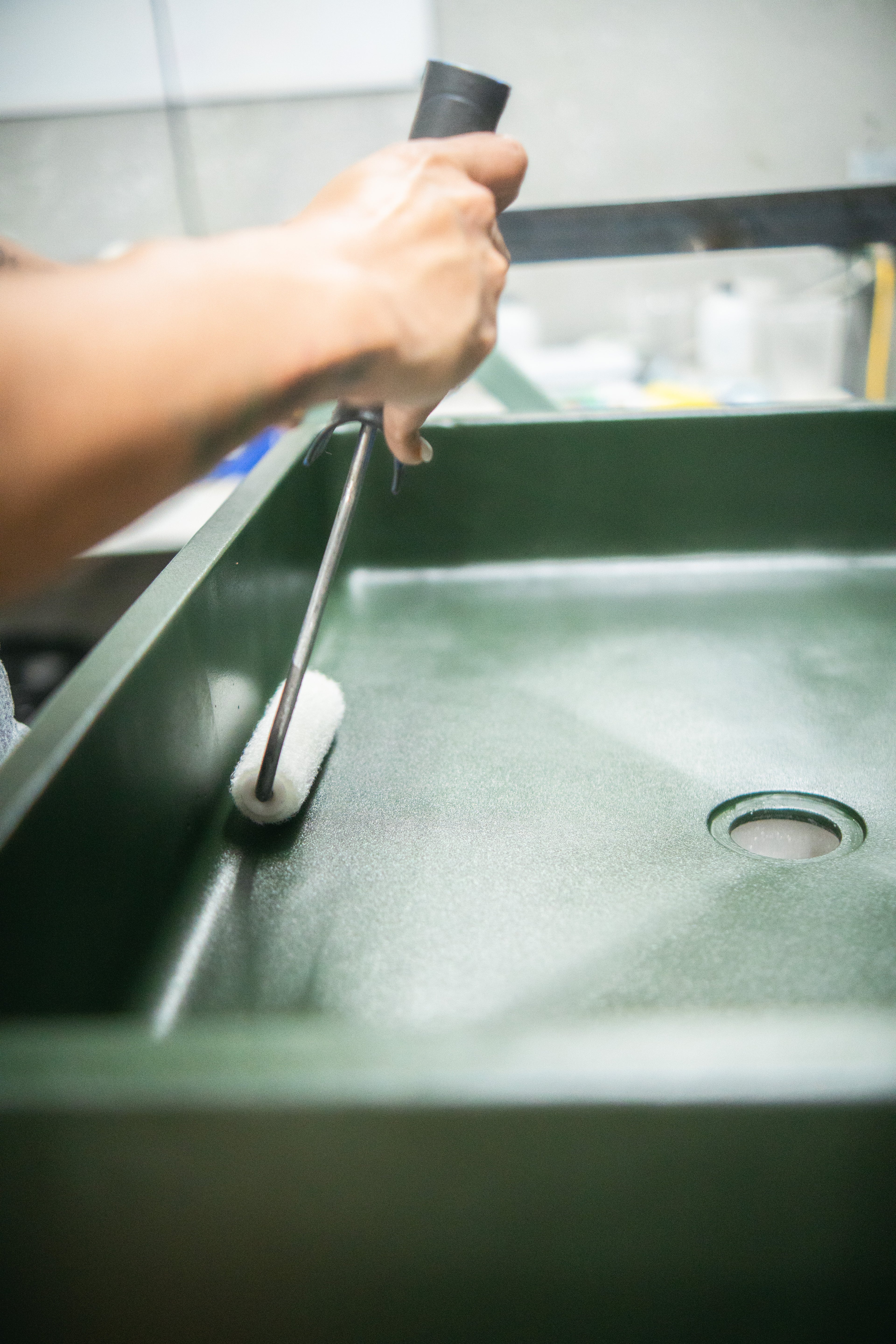 After pouring, sinks rest overnight to set before being removed from their molds and fully cured in a controlled environment. Each piece is inspected for structural soundness, proper drainage, clean edges, and surface consistency, with only those meeting strict standards moving forward.