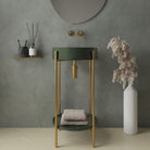 A freestanding console for the minimalist seeking a combination between luxurious design and functionality. This console pairs a soft-touch, rounded metal stand that blends so effortlessly into the surrounding atmosphere with a handcrafted concrete tray to allow for extra surface space.